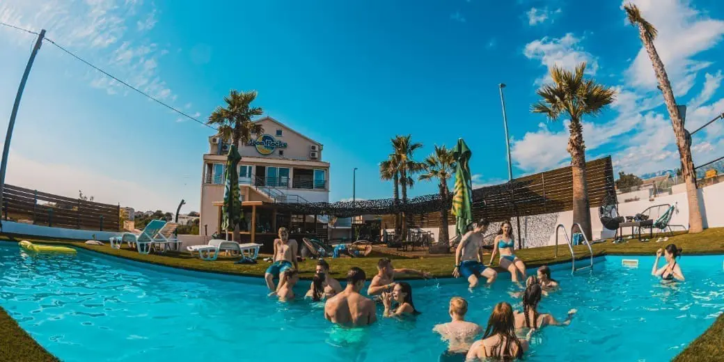 Wir bieten hier mehrere gut geführte und ordentliche Häuser mit einem guten Leistungsangebot an. Das Hostel Timun in super zentraler Lage im Herzen von Novalja, direkt am Meer und das Moon&Rocks Hostel mit Pool Area und Bushaltestelle direkt vor der Tür. Am Moon&Rocks Hostel findet auch unser Check-in für alle Unterkünfte und Festivals statt.